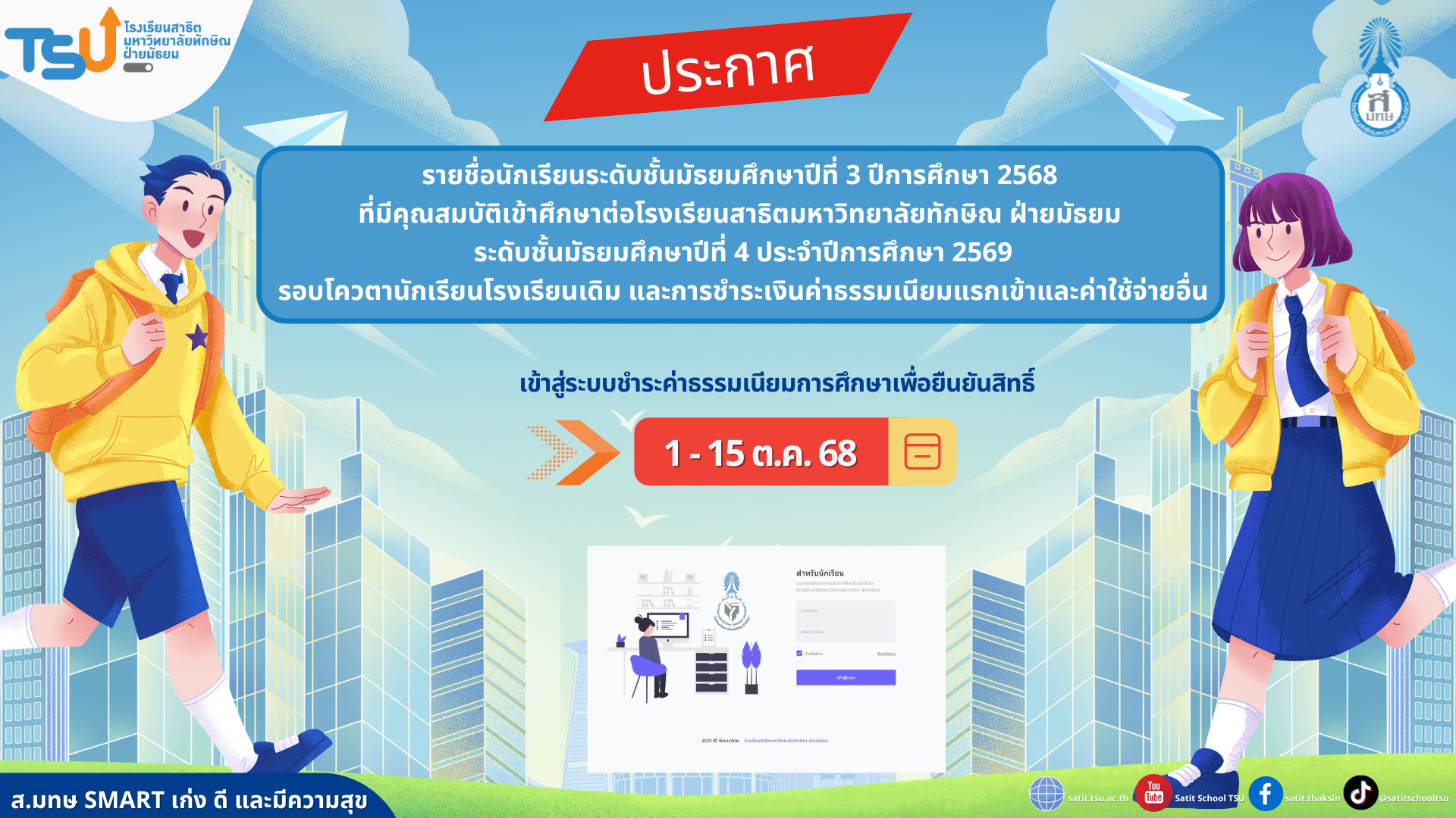 ขอเชิญเข้าร่วมโครงการปฐมนิเทศและประชุมผู้ปกครองนักเรียน ปีการศึกษา 2568 โรงเรียนสาธิตมหาวิทยาลัยทักษิณ ฝ่ายมัธยม ระดับชั้นมัธยมศึกษาปีที่ 1 และ ปีที่ 4