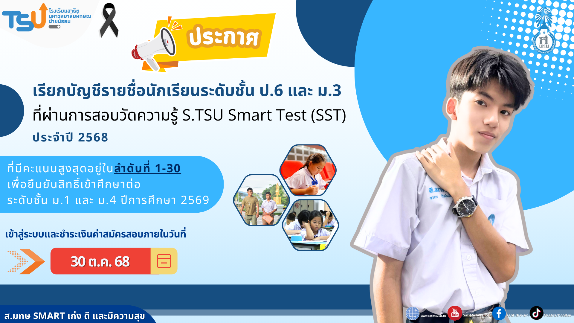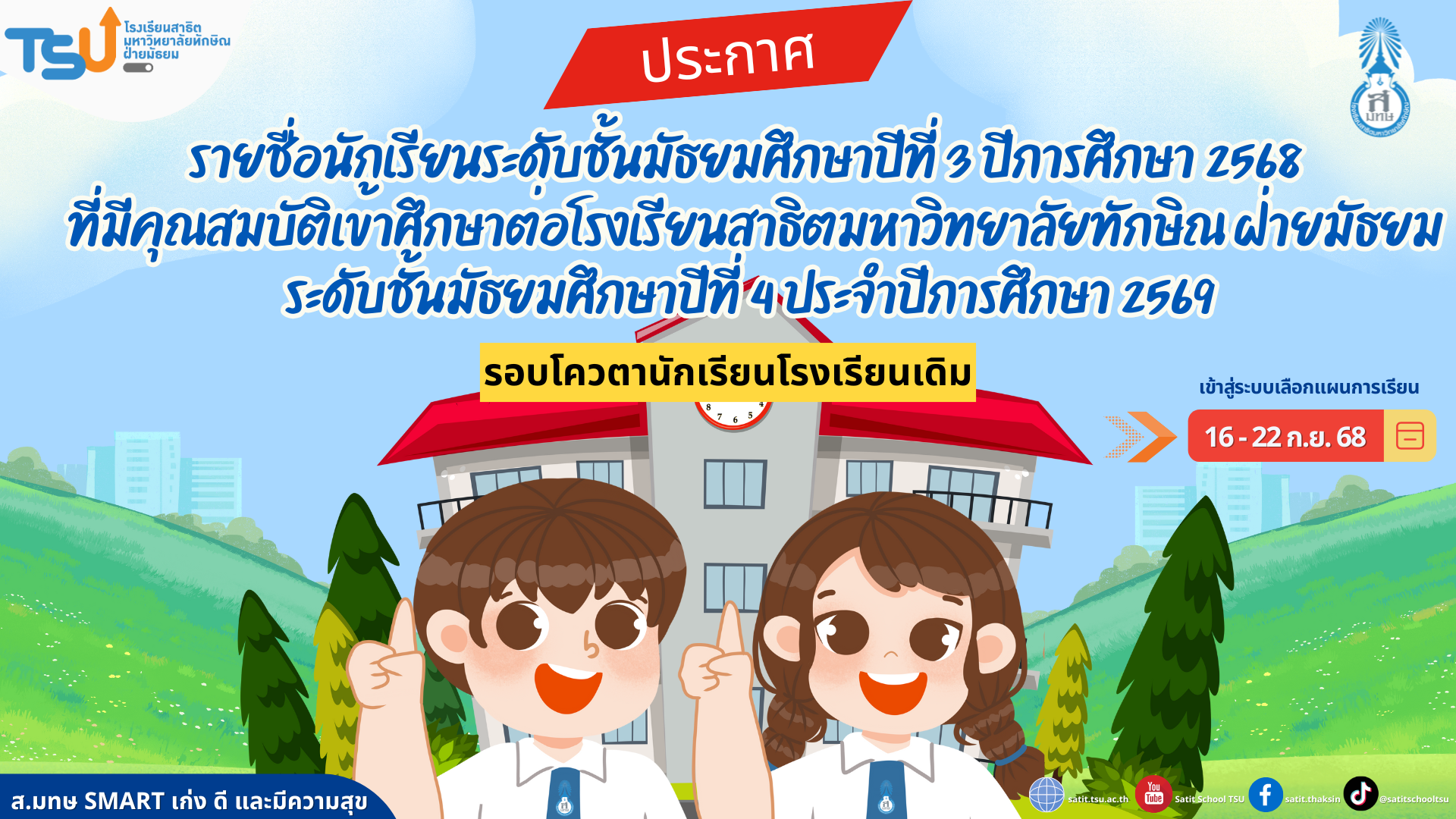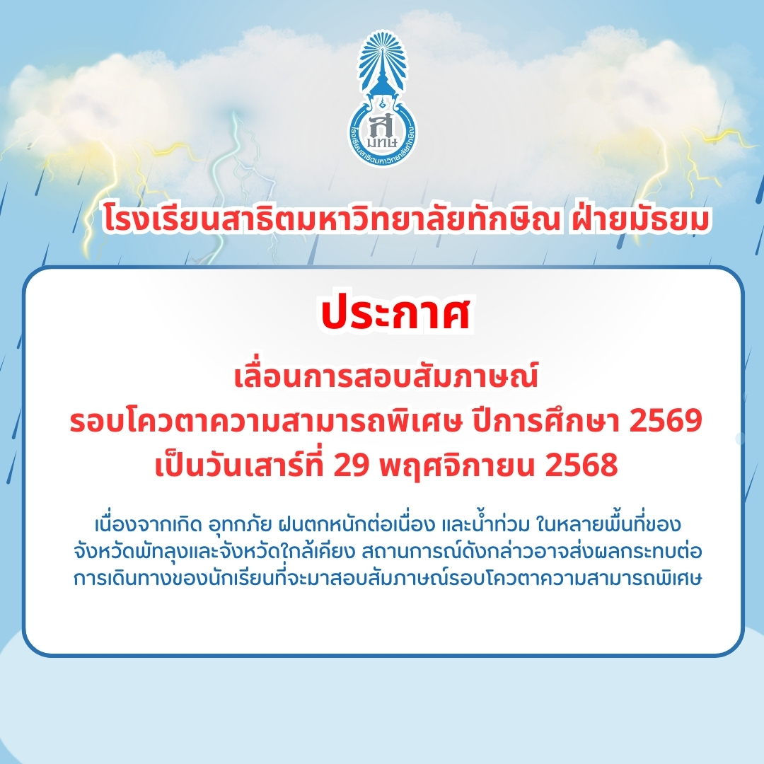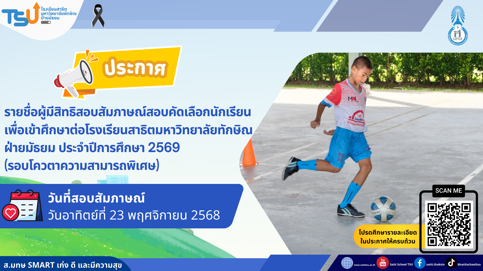 ประกาศผลการสอบคัดเลือกนักเรียนเพื่อเข้าศึกษาต่อโรงเรียนสาธิตมหาวิทยาลัยทักษิณ ฝ่ายมัธยม ประจำปีการศึกษา 2569 รอบโควตาความสามารถพิเศษ