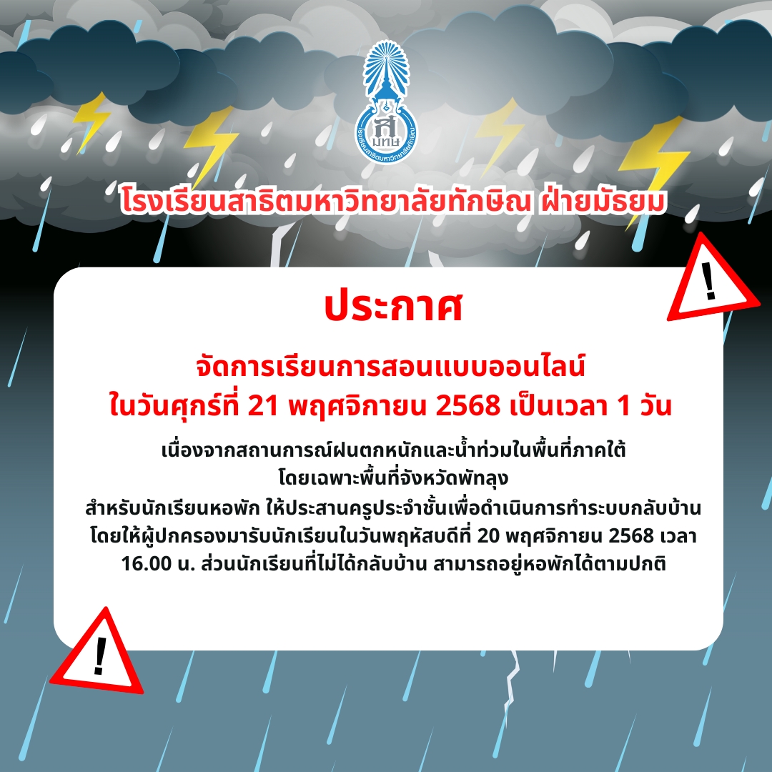 ประกาศจัดการเรียนการสอนแบบออนไลน์ เนื่องจากสถานการณ์ฝนตกหนักและน้ำท่วมในพื้นที่ภาคใต้ โดยเฉพาะพื้นที่จังหวัดพัทลุง