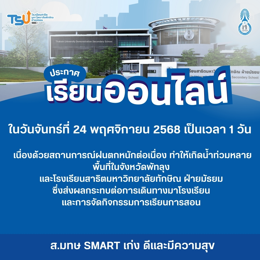 ประกาศจัดการเรียนการสอนแบบออนไลน์ ในวันจันทร์ที่ 24 พฤศจิกายน 2568