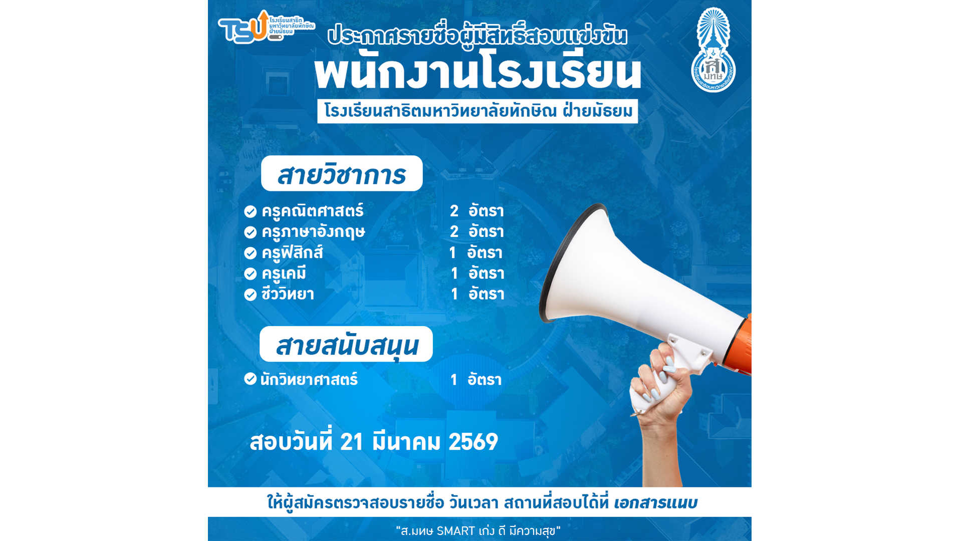 ประกาศรายชื่อผู้มีสิทธิเข้ารับการสอบแข่งขันเพื่อบรรจุเป็นพนักงานโรงเรียน ประเภทสายวิชาการ และสายสนับสนุน ภาคความรู้ความสามารถทั่วไป และภาคความรู้ความสามารถเฉพาะตำแหน่ง