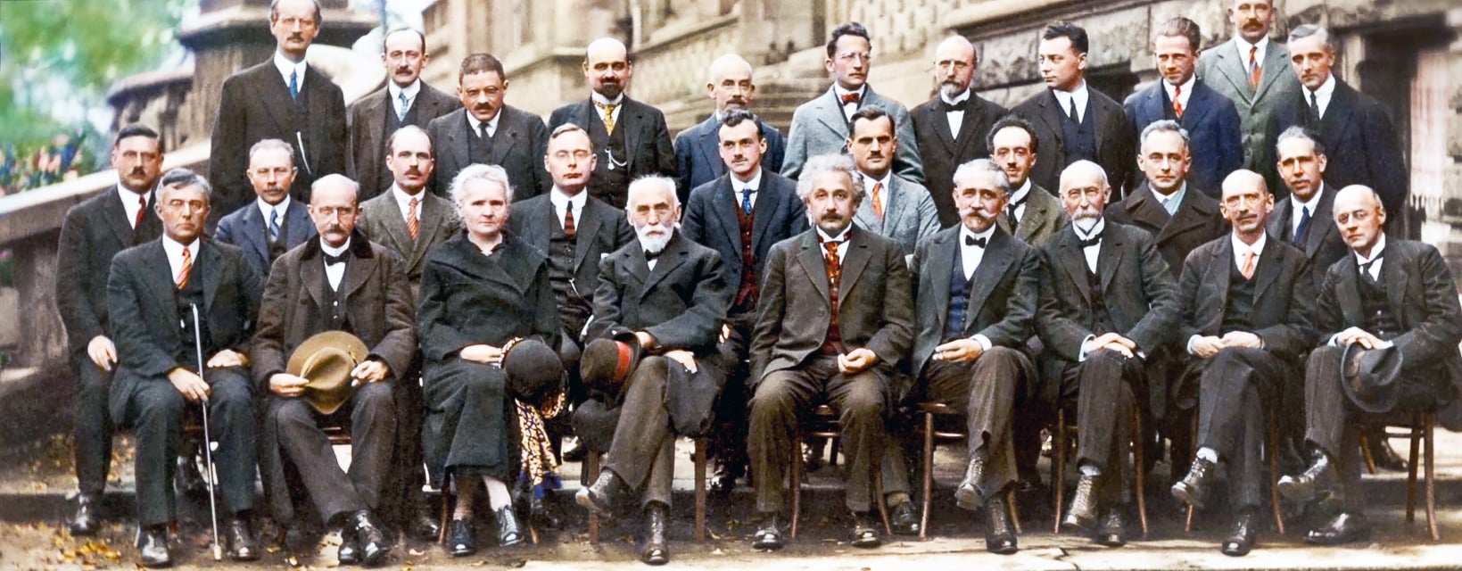 ภาพประวัติศาสตร์นี้ถูกถ่ายในปี ค.ศ. 1927 ในงานประชุมSolvay ครั้งที่ 5 ในภาพมีนักฟิสิกส์และนักเคมีที่สร้างผลงานระดับโลกมากมาย
