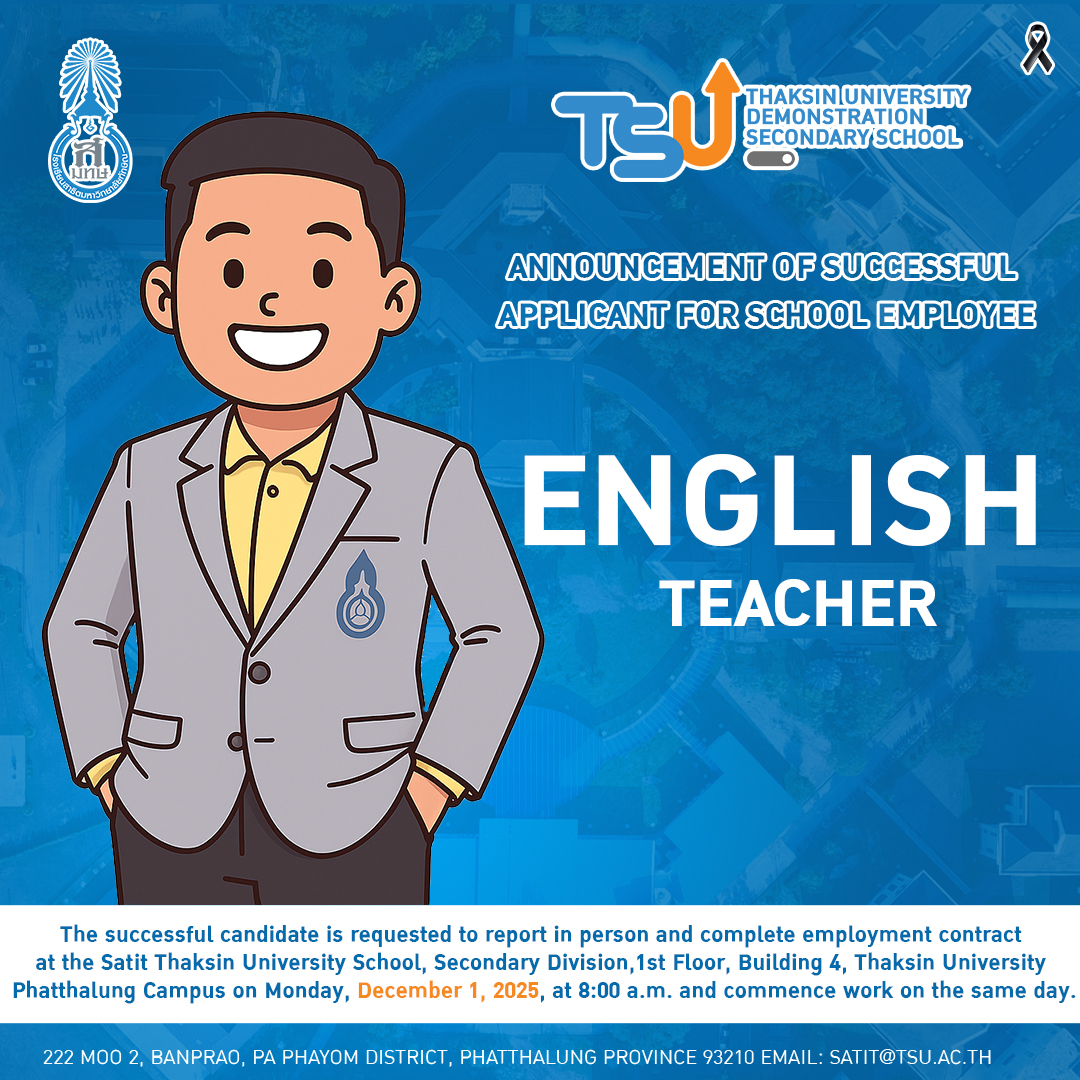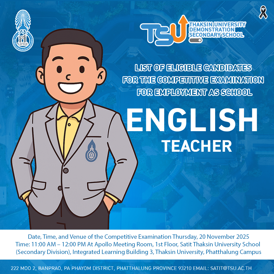 ประกาศรายชื่อผู้มีสิทธิเข้ารับการสอบแข่งขันเพื่อบรรจุเป็นพนักงานโรงเรียน ประเภทสายวิชาการ ภาคความรู้ความสามารถเฉพาะตำแหน่ง (การสอบสอนและสอบสัมภาษณ์) ตำแหน่ง “ครูกลุ่มวิชาภาษาอังกฤษ”