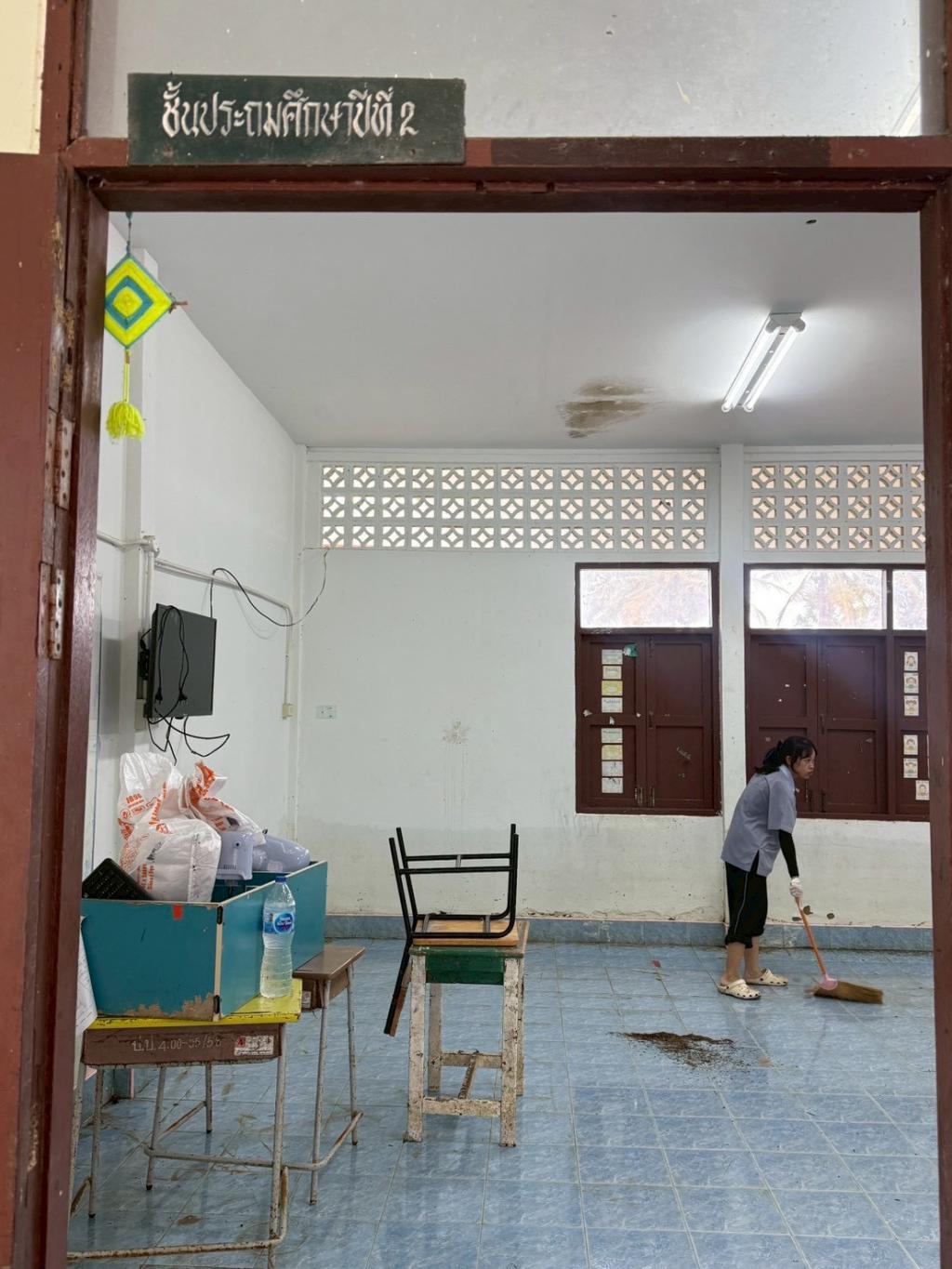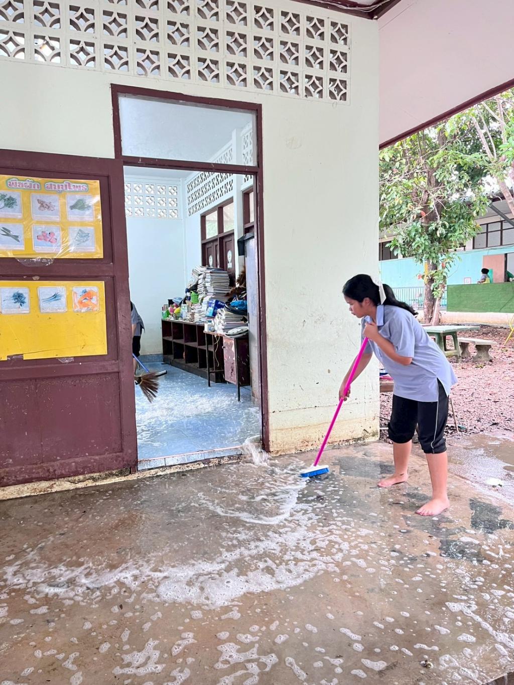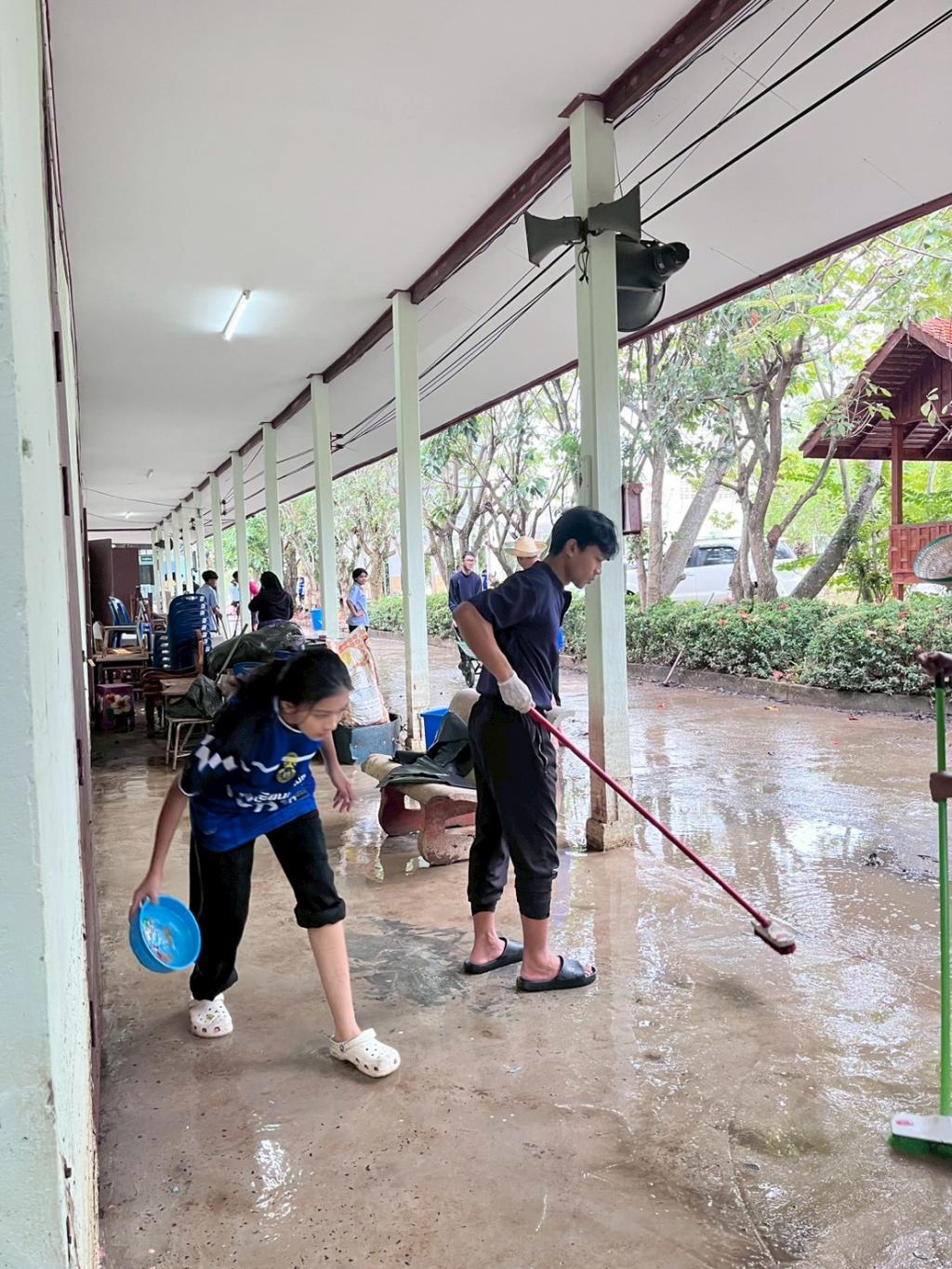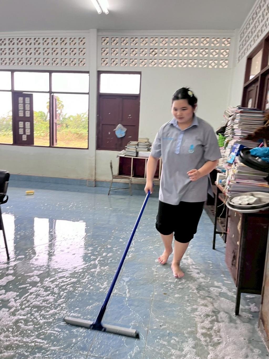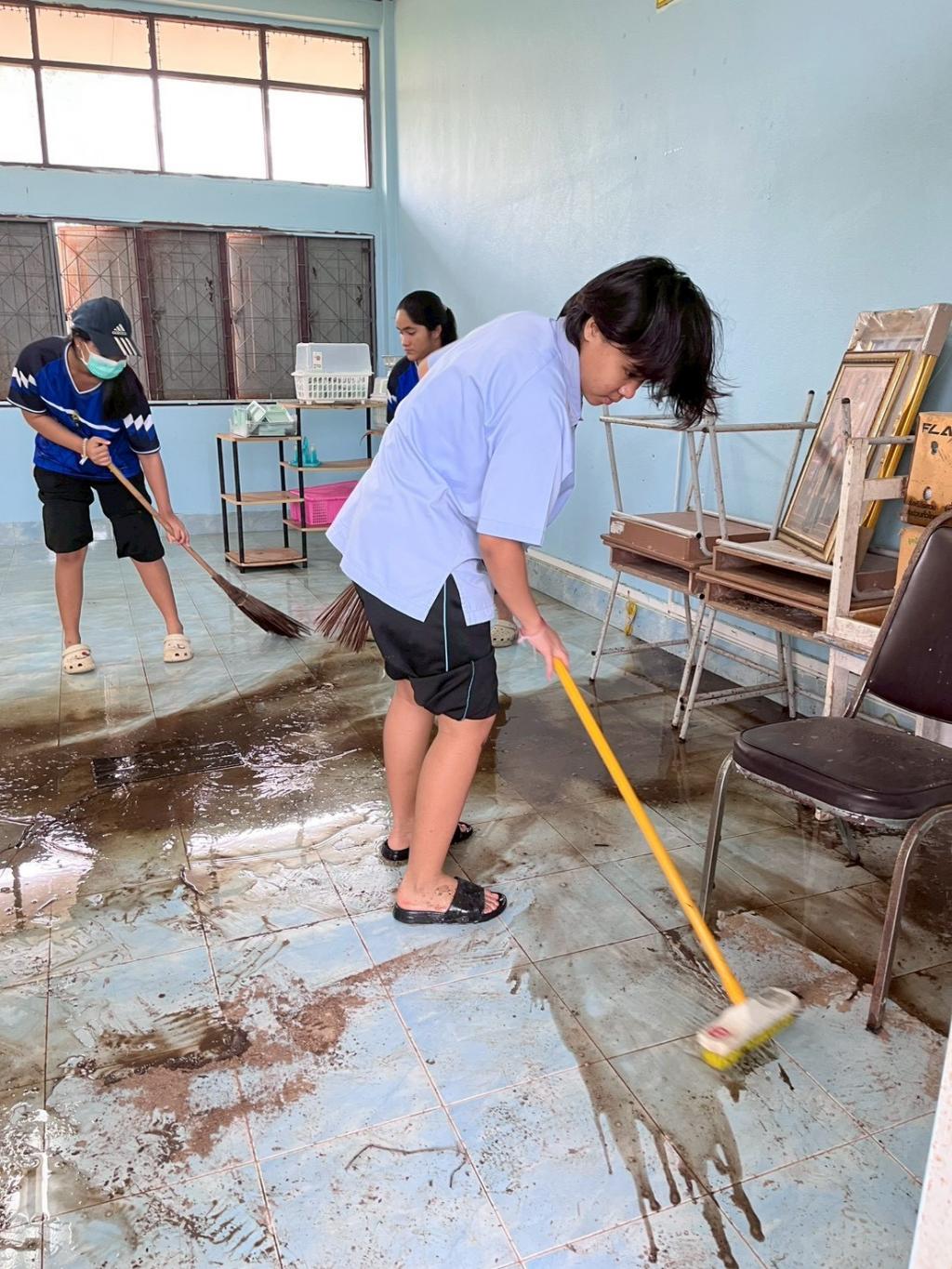 • ทำความสะอาดอาคารเรียน โต๊ะ เก้าอี้ และบริเวณโดยรอบหลังน้ำลด
