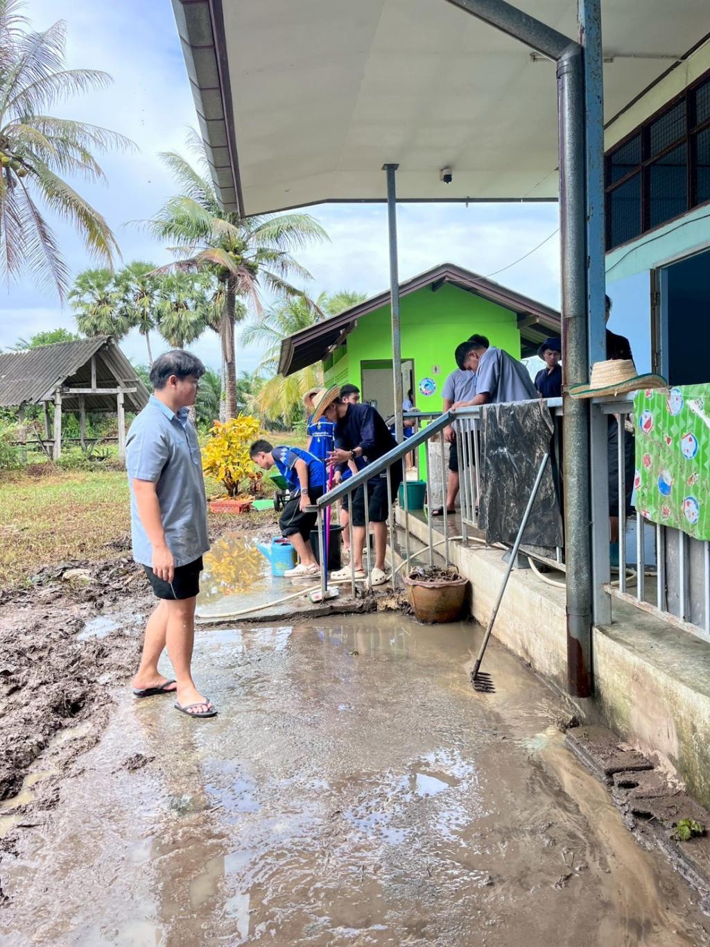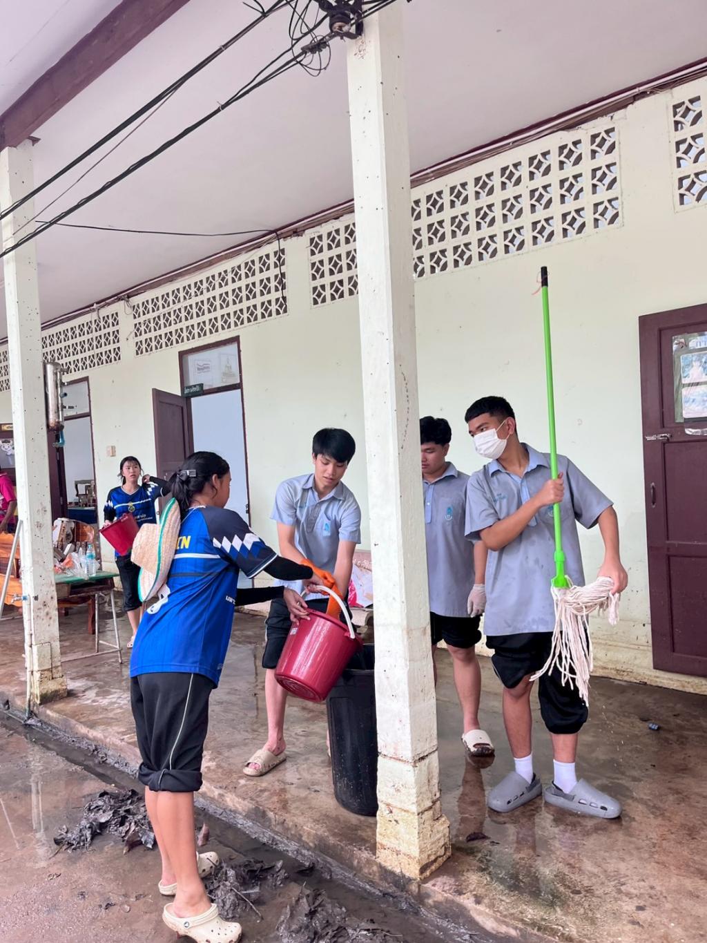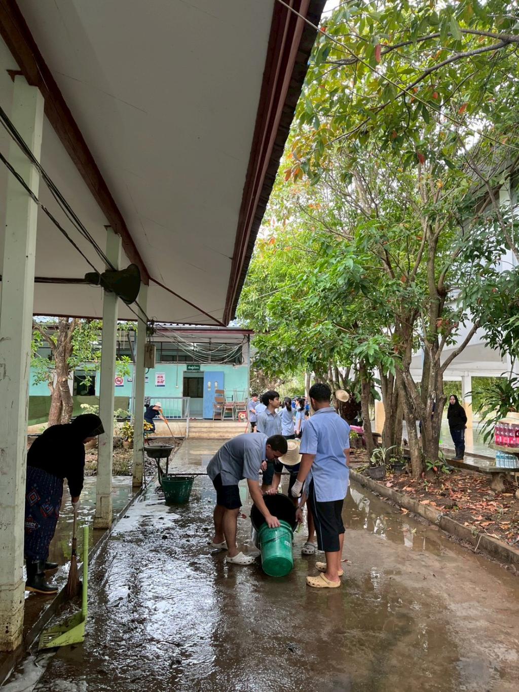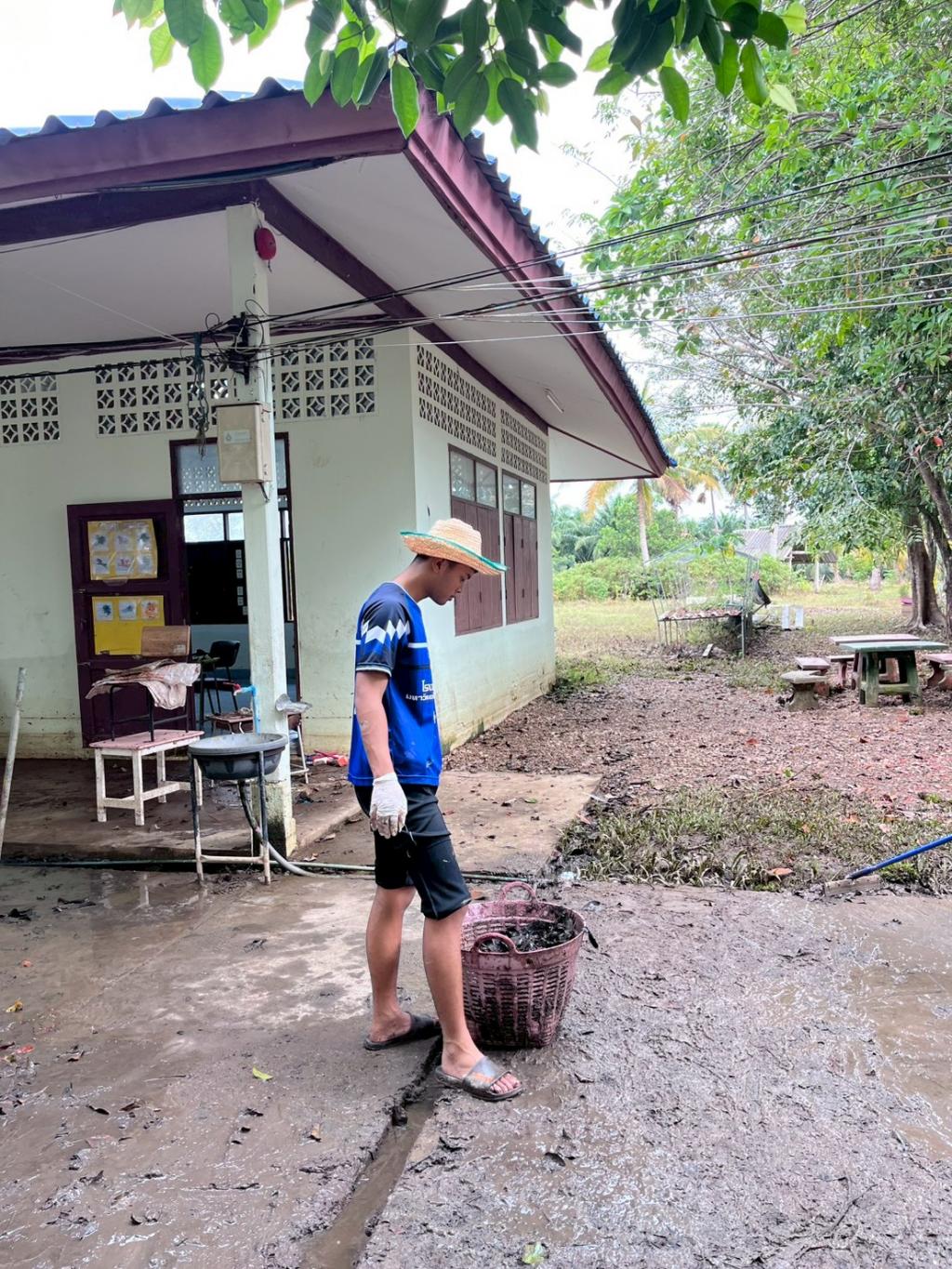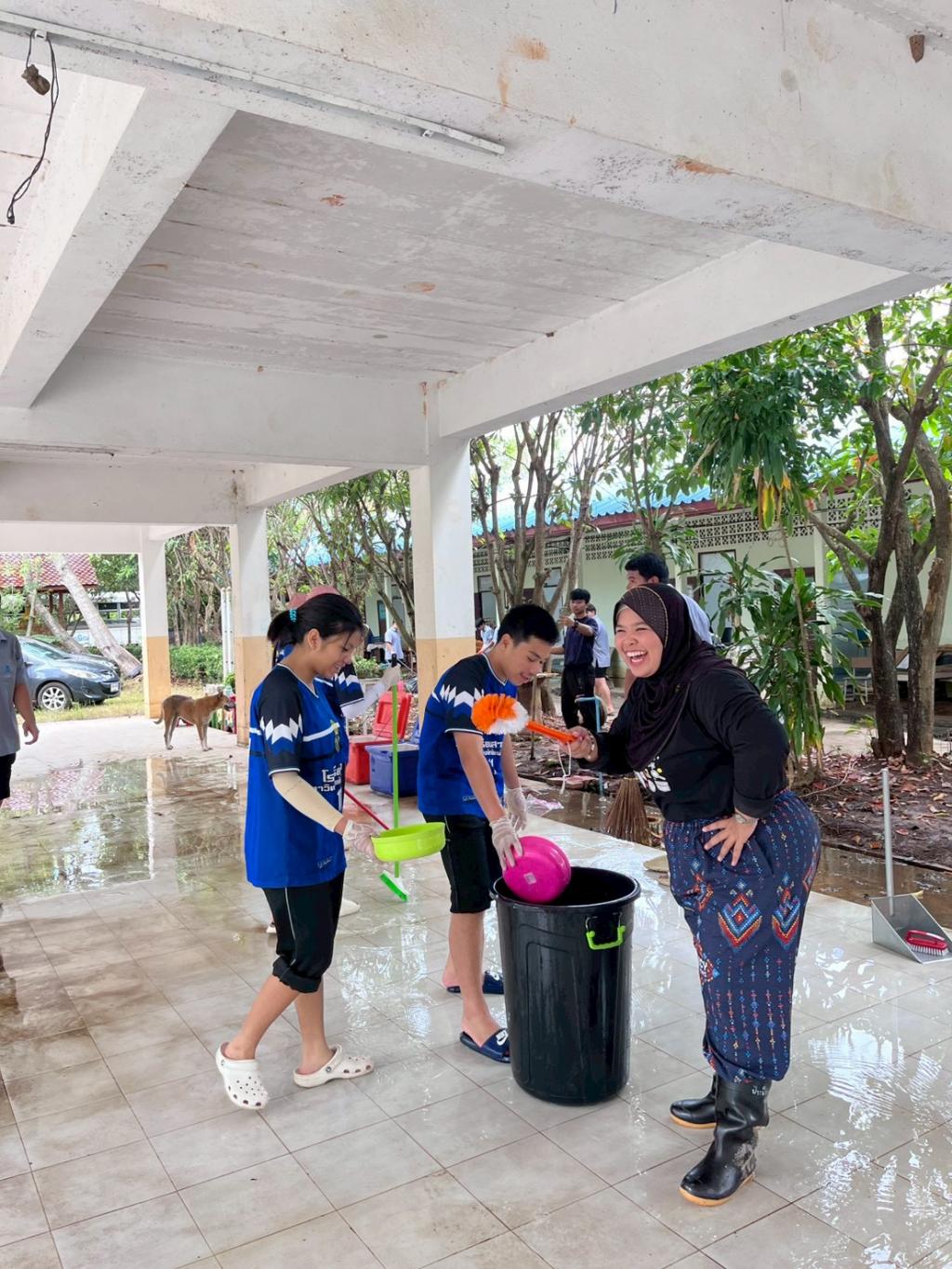 • ทำความสะอาดอาคารเรียน โต๊ะ เก้าอี้ และบริเวณโดยรอบหลังน้ำลด