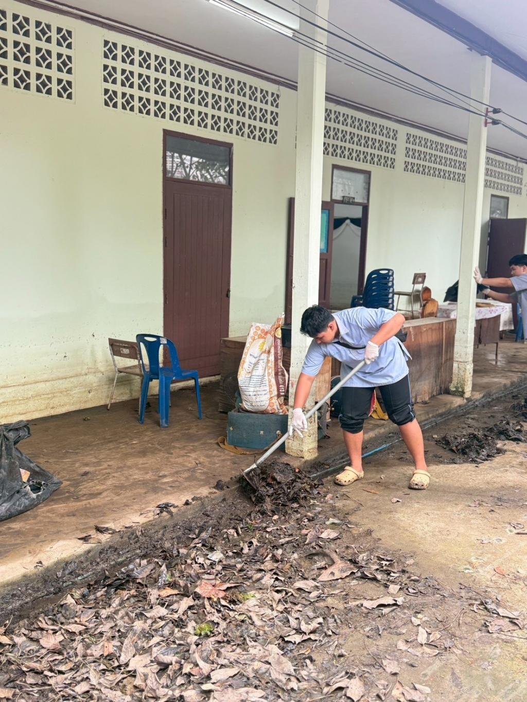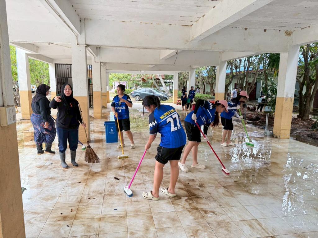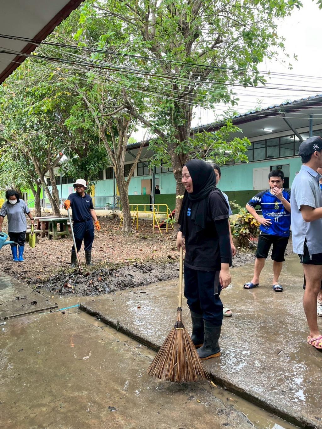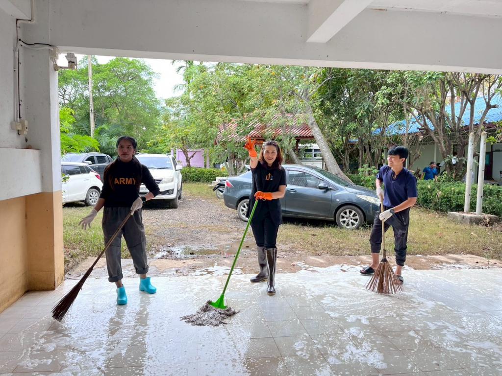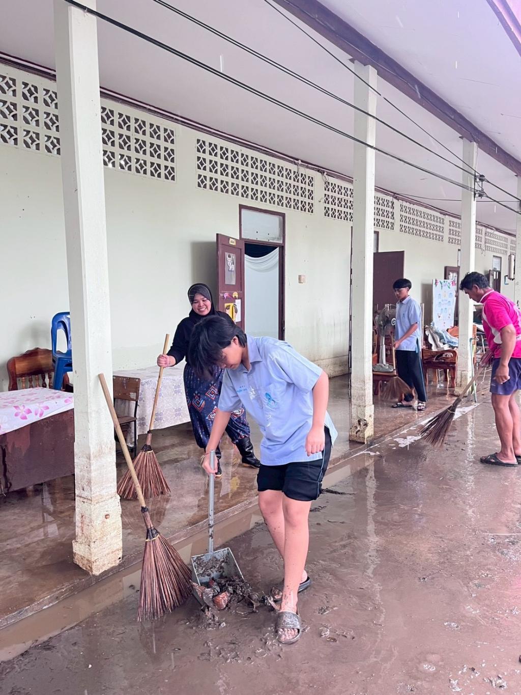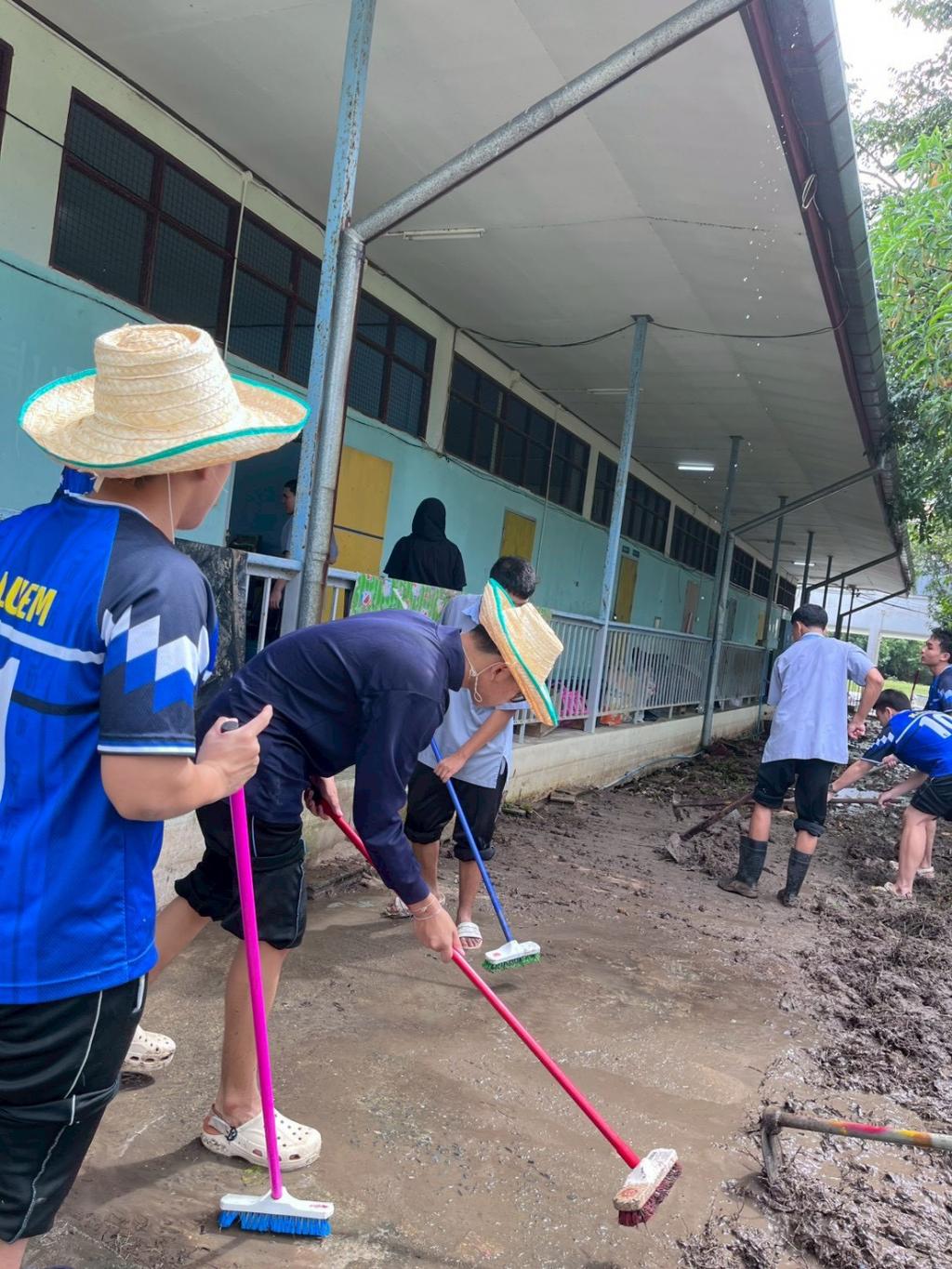 • ทำความสะอาดอาคารเรียน โต๊ะ เก้าอี้ และบริเวณโดยรอบหลังน้ำลด