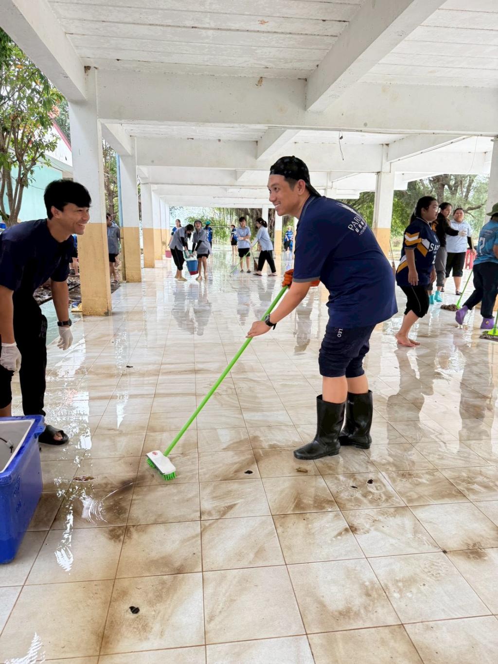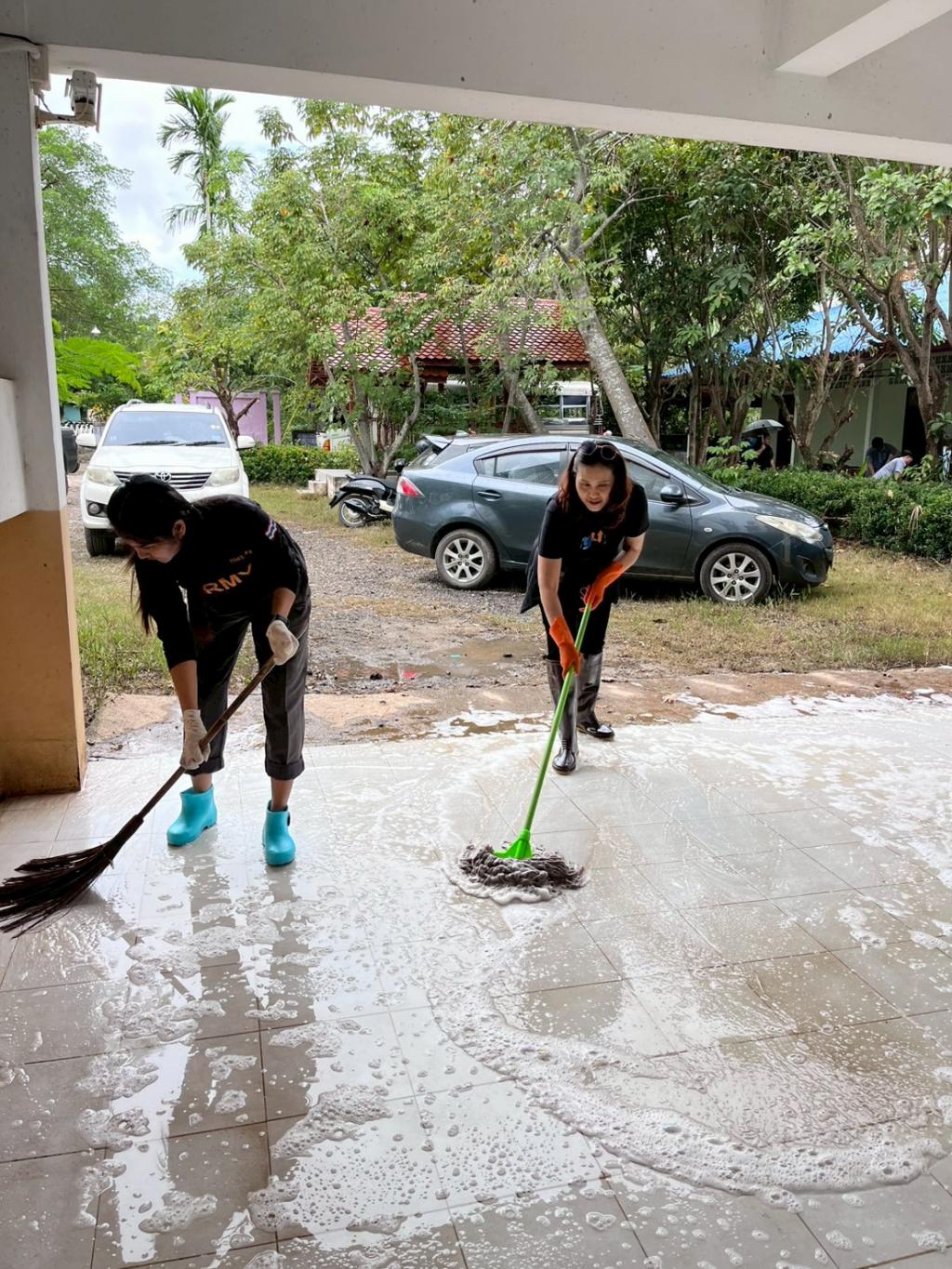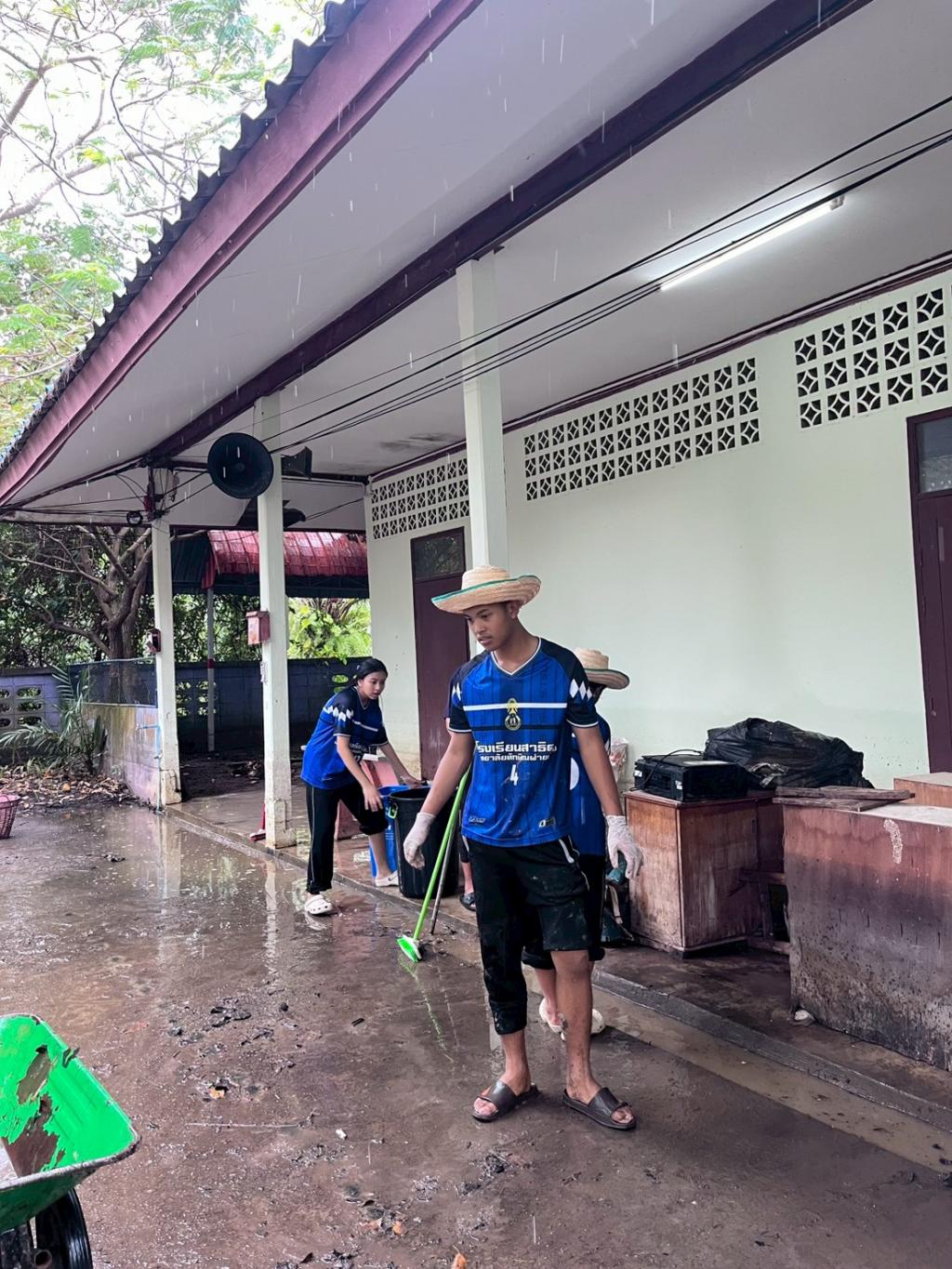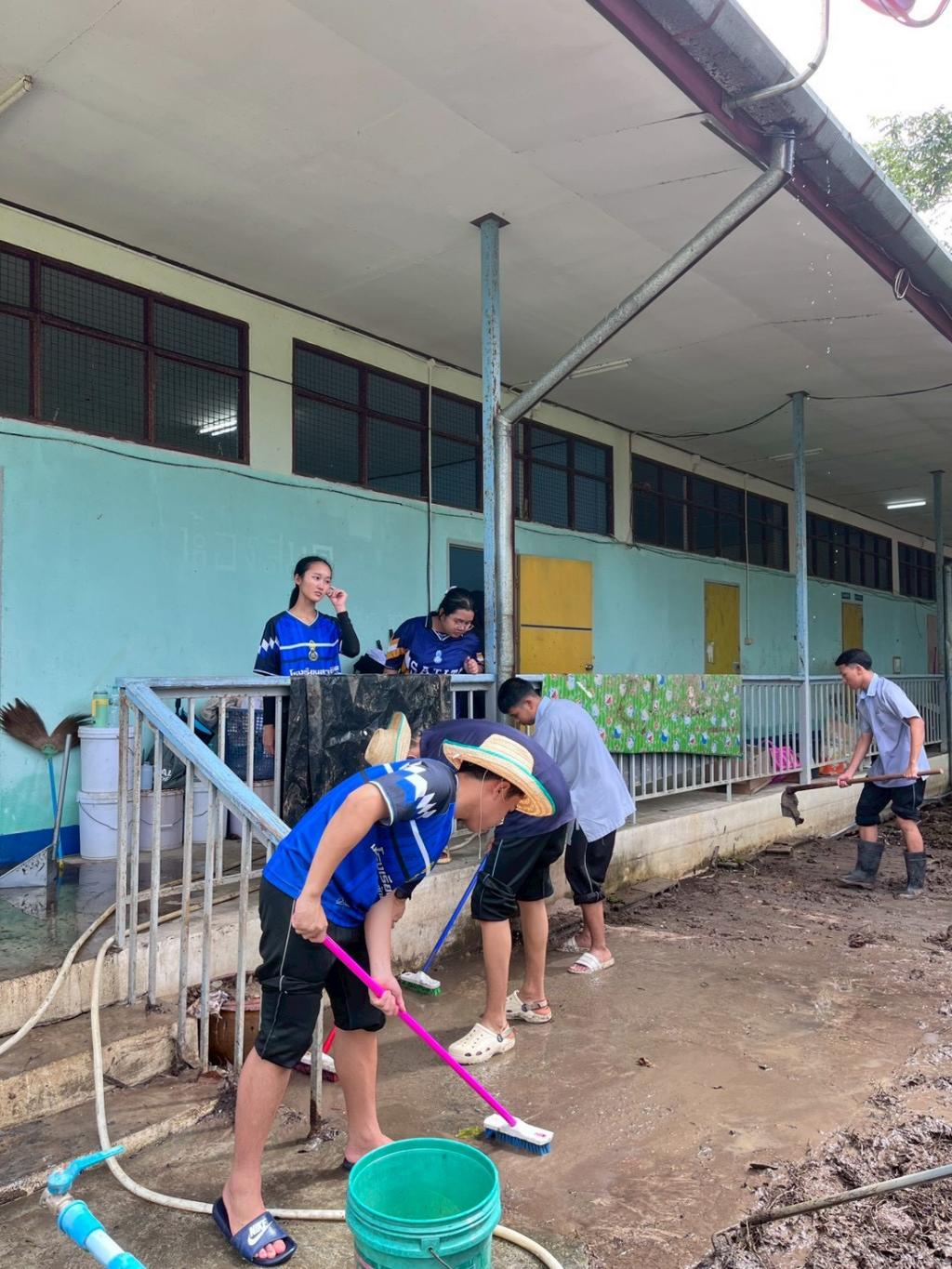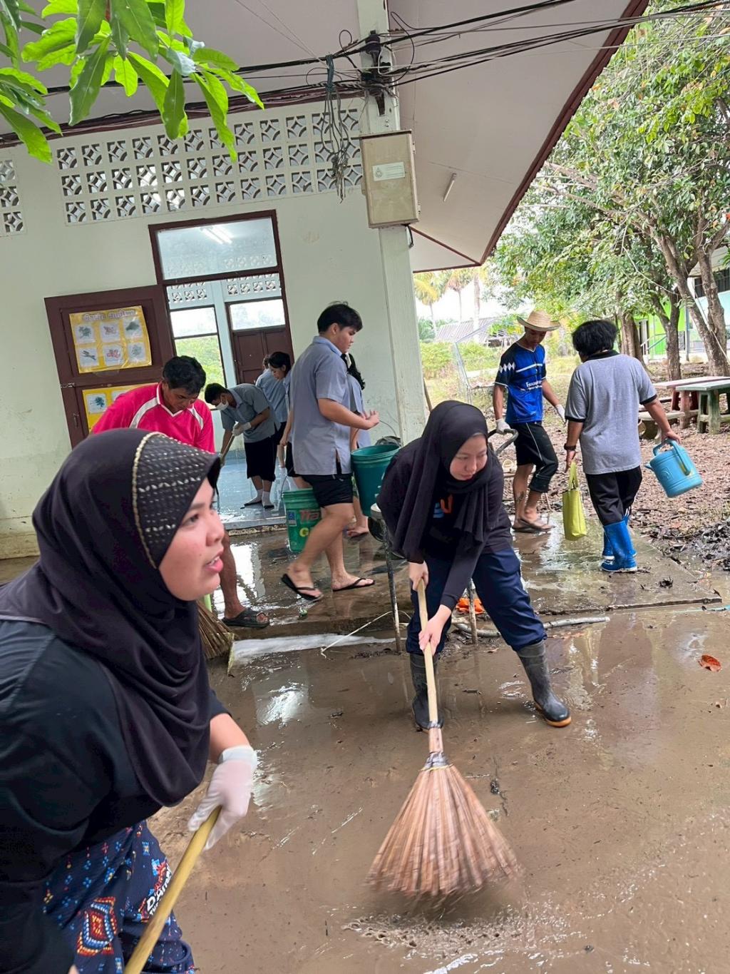 • ทำความสะอาดอาคารเรียน โต๊ะ เก้าอี้ และบริเวณโดยรอบหลังน้ำลด