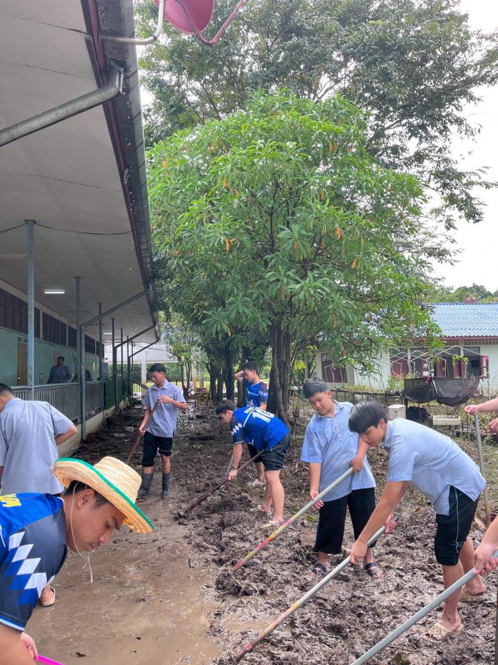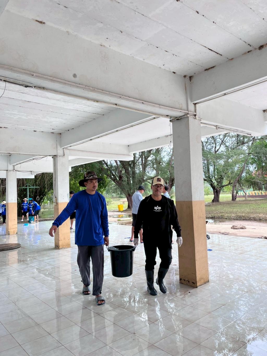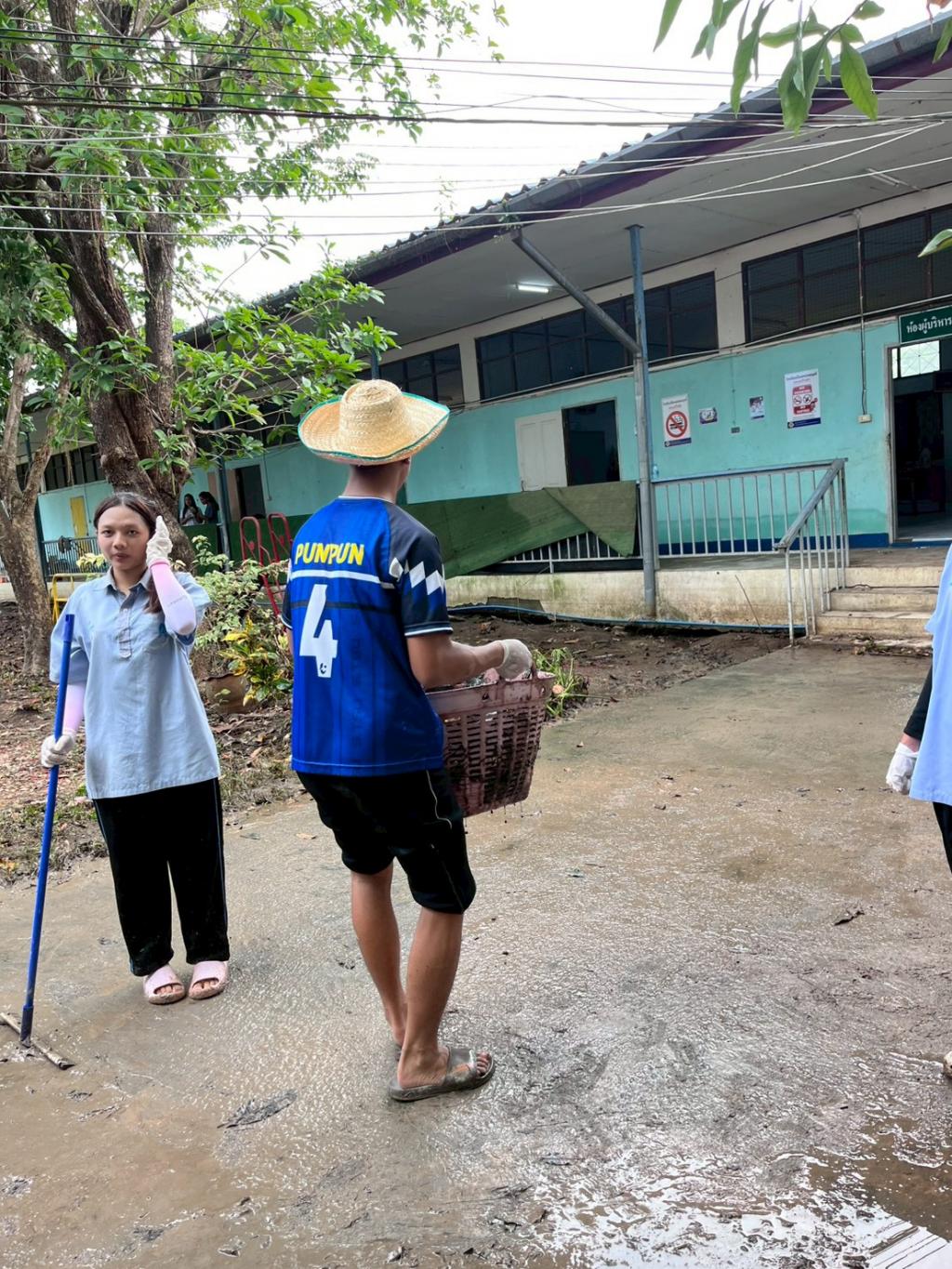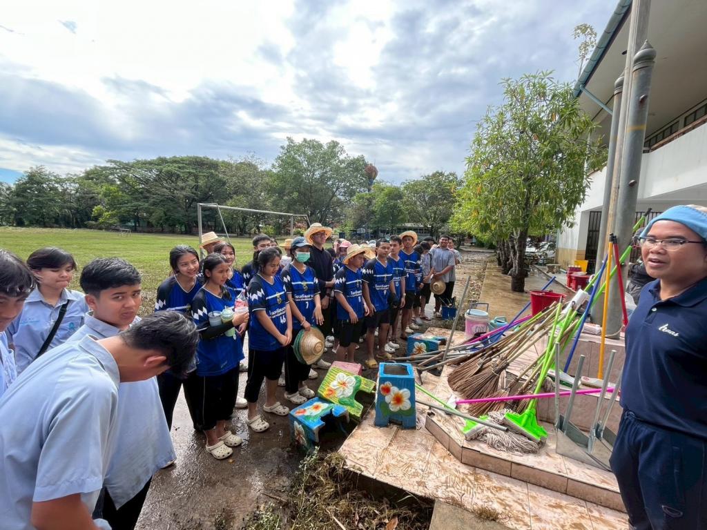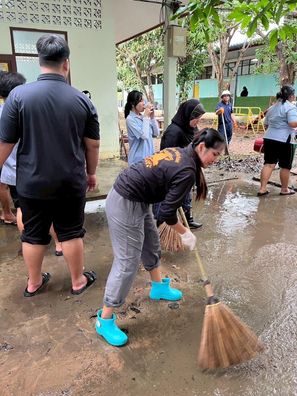 • ทำความสะอาดอาคารเรียน โต๊ะ เก้าอี้ และบริเวณโดยรอบหลังน้ำลด