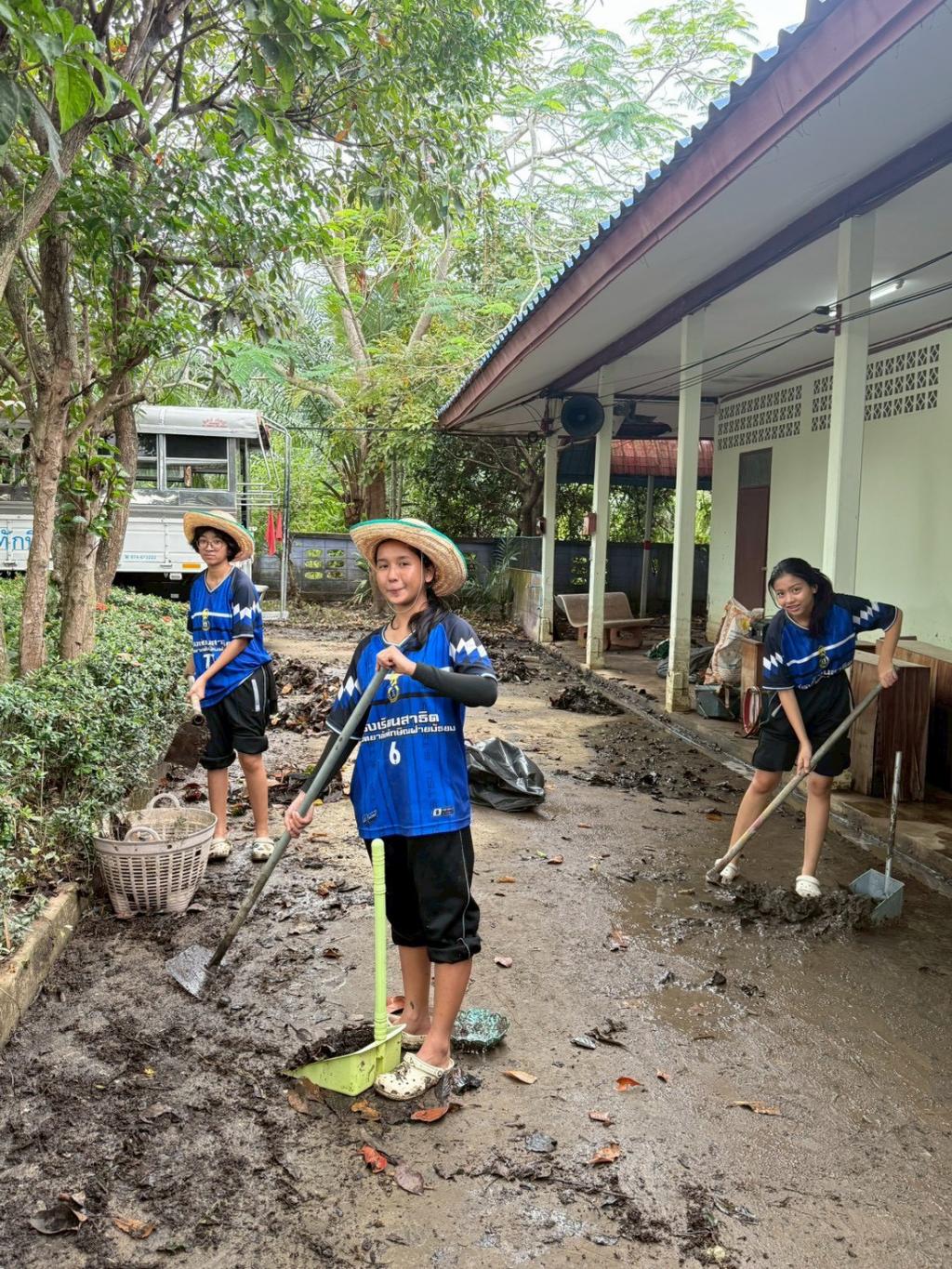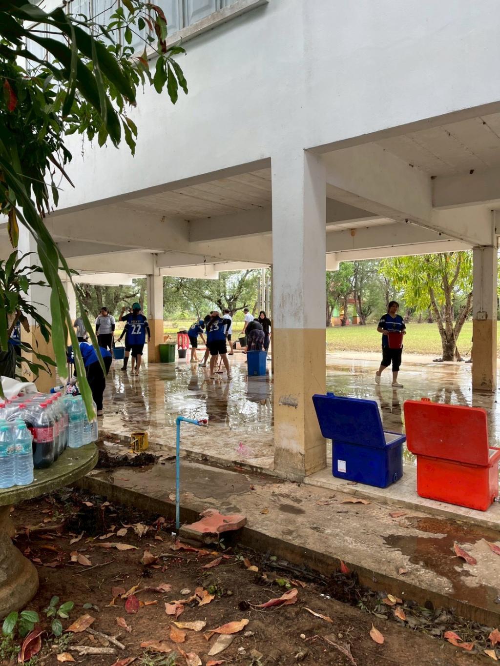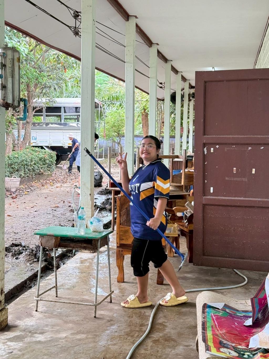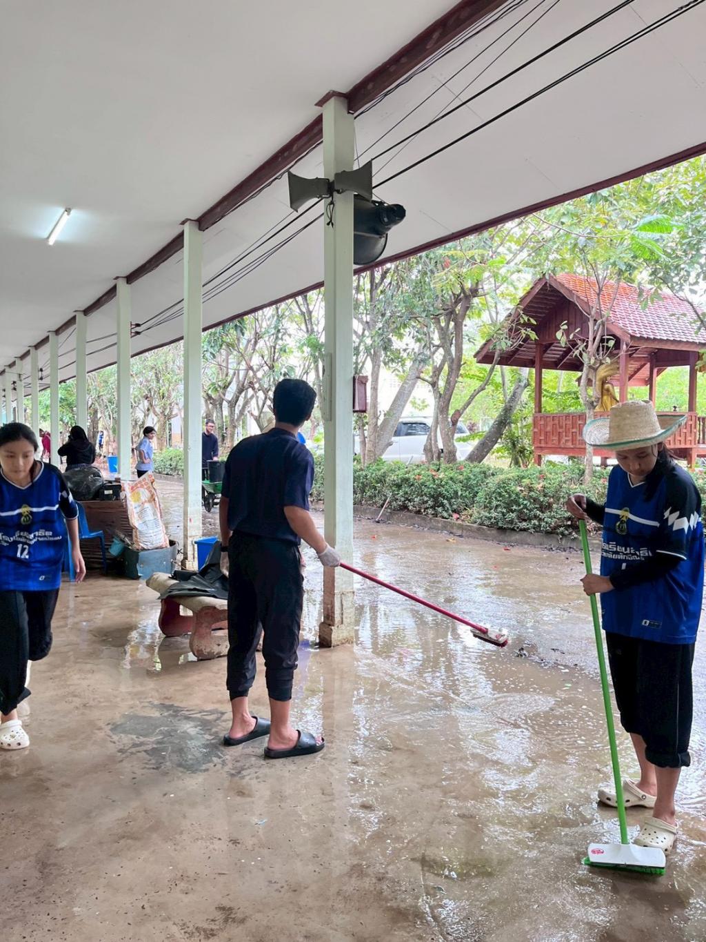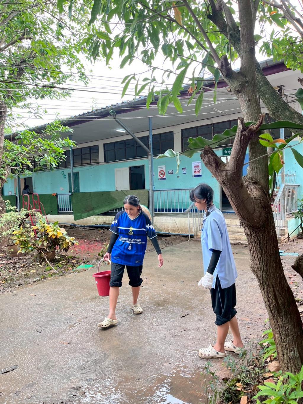 • ทำความสะอาดอาคารเรียน โต๊ะ เก้าอี้ และบริเวณโดยรอบหลังน้ำลด