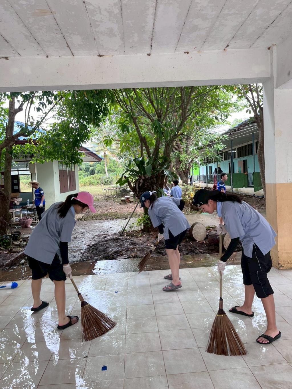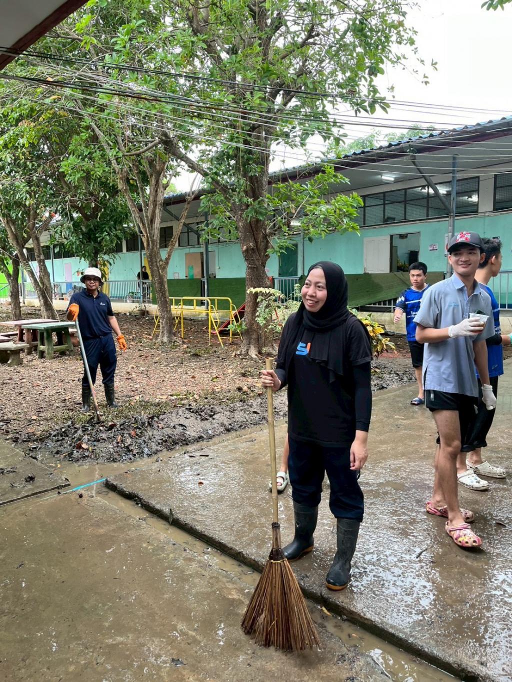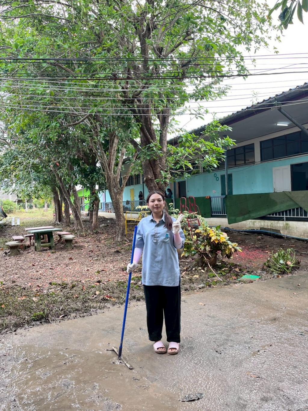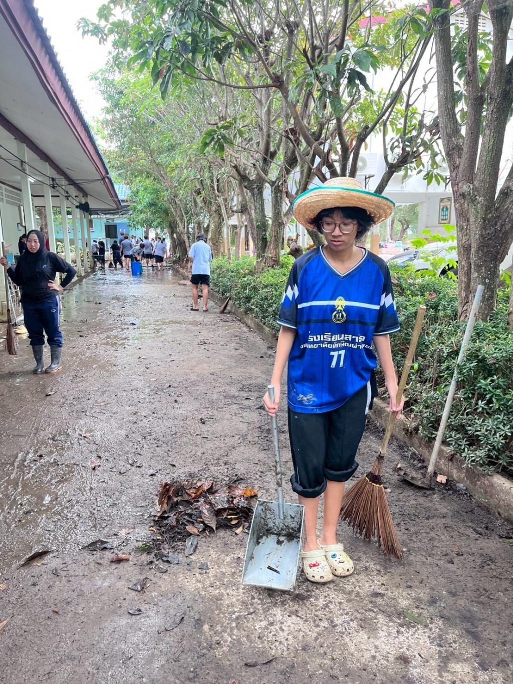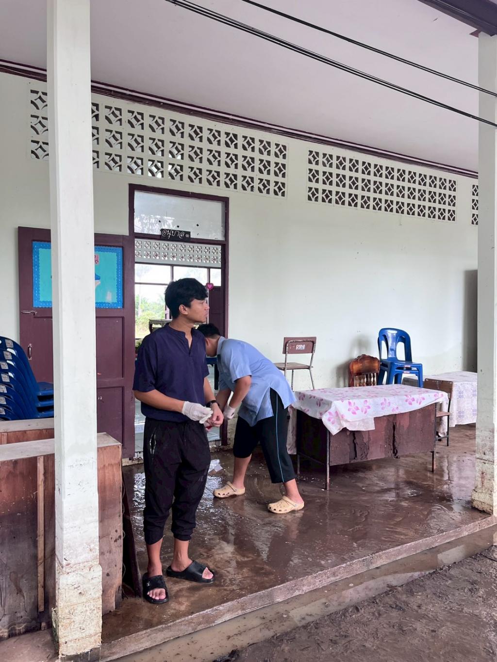 • ทำความสะอาดอาคารเรียน โต๊ะ เก้าอี้ และบริเวณโดยรอบหลังน้ำลด