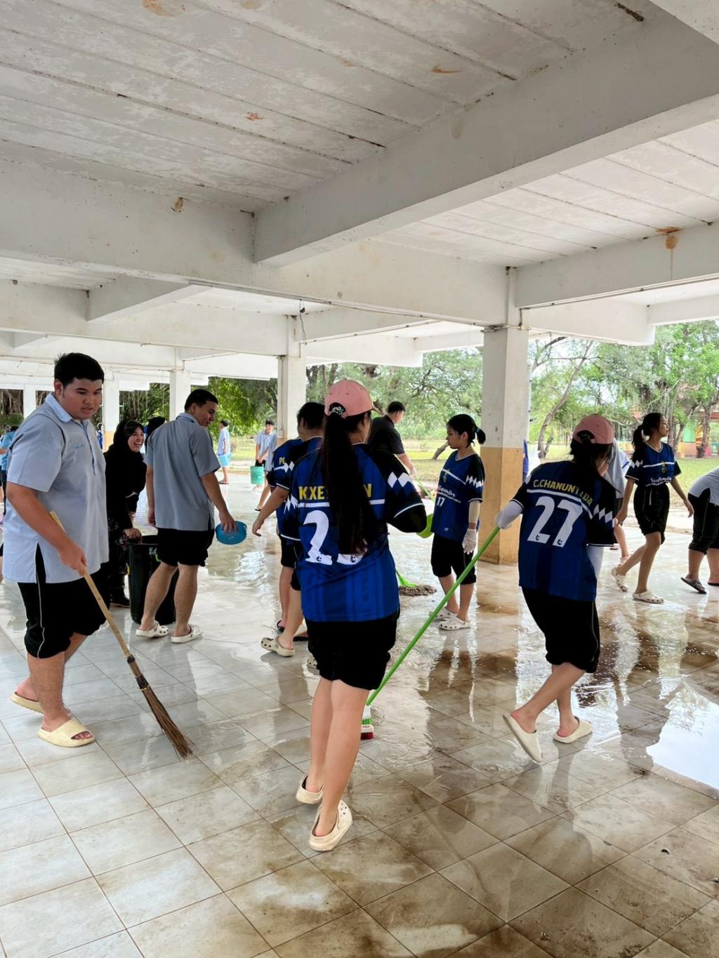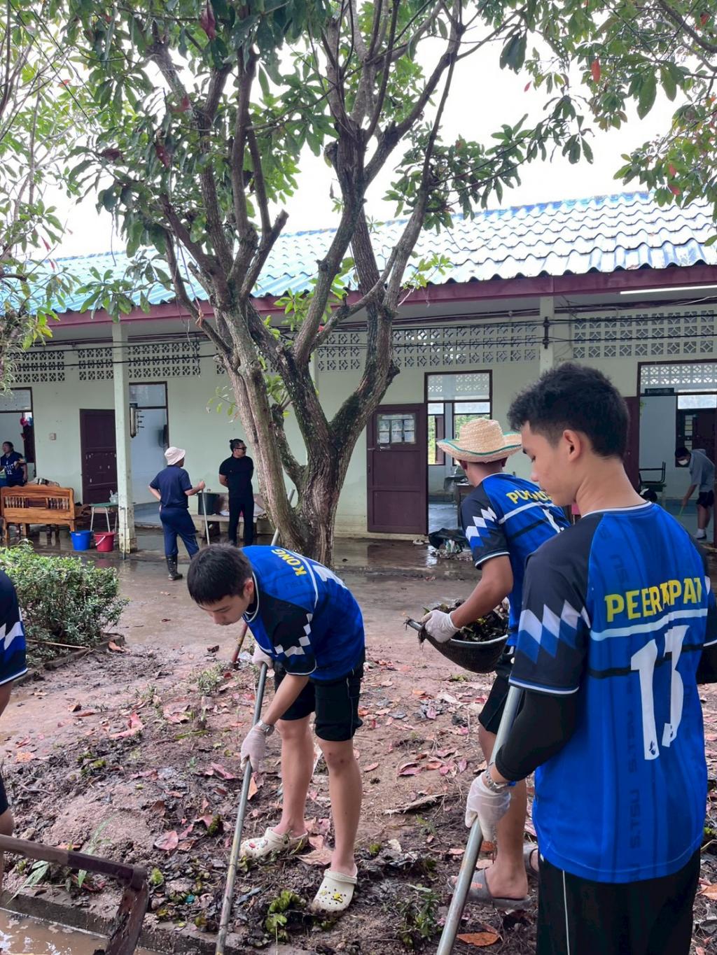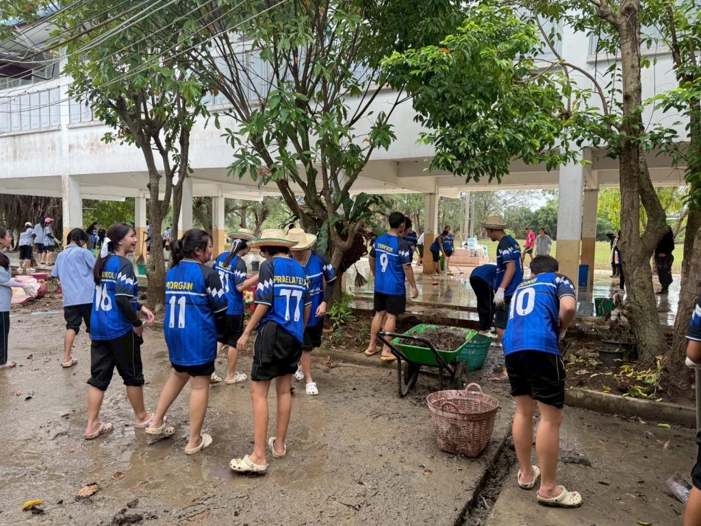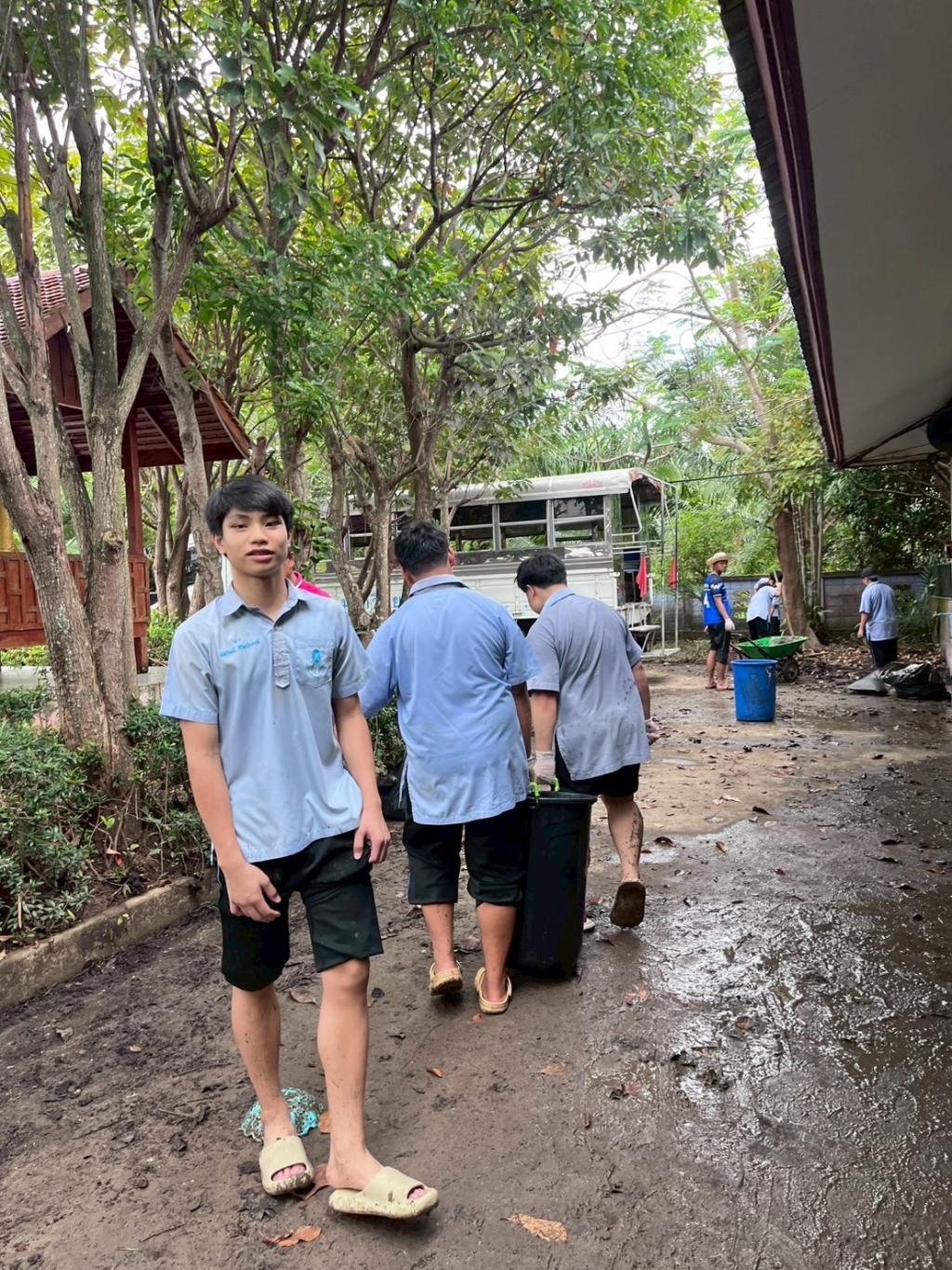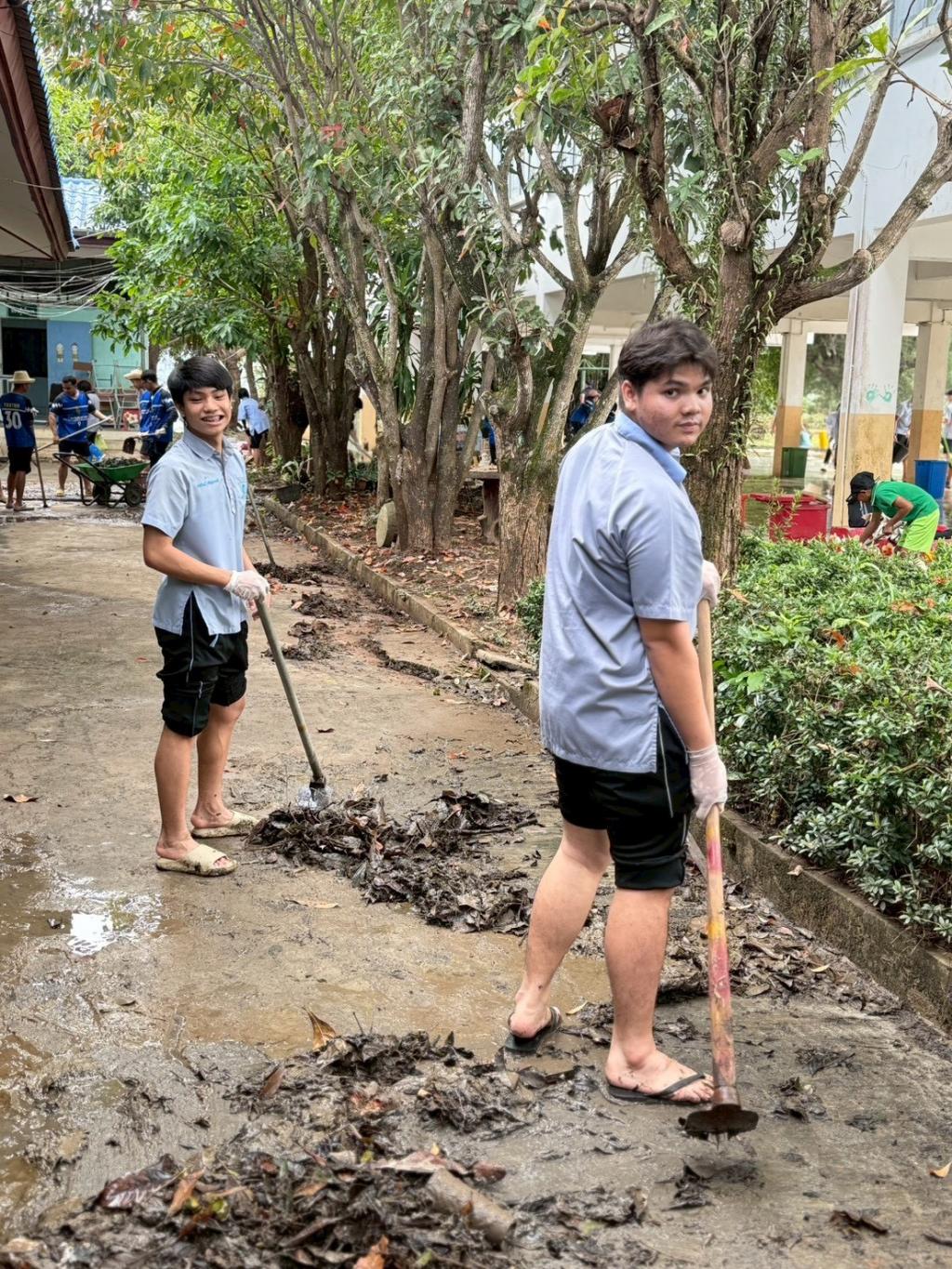 • ทำความสะอาดอาคารเรียน โต๊ะ เก้าอี้ และบริเวณโดยรอบหลังน้ำลด