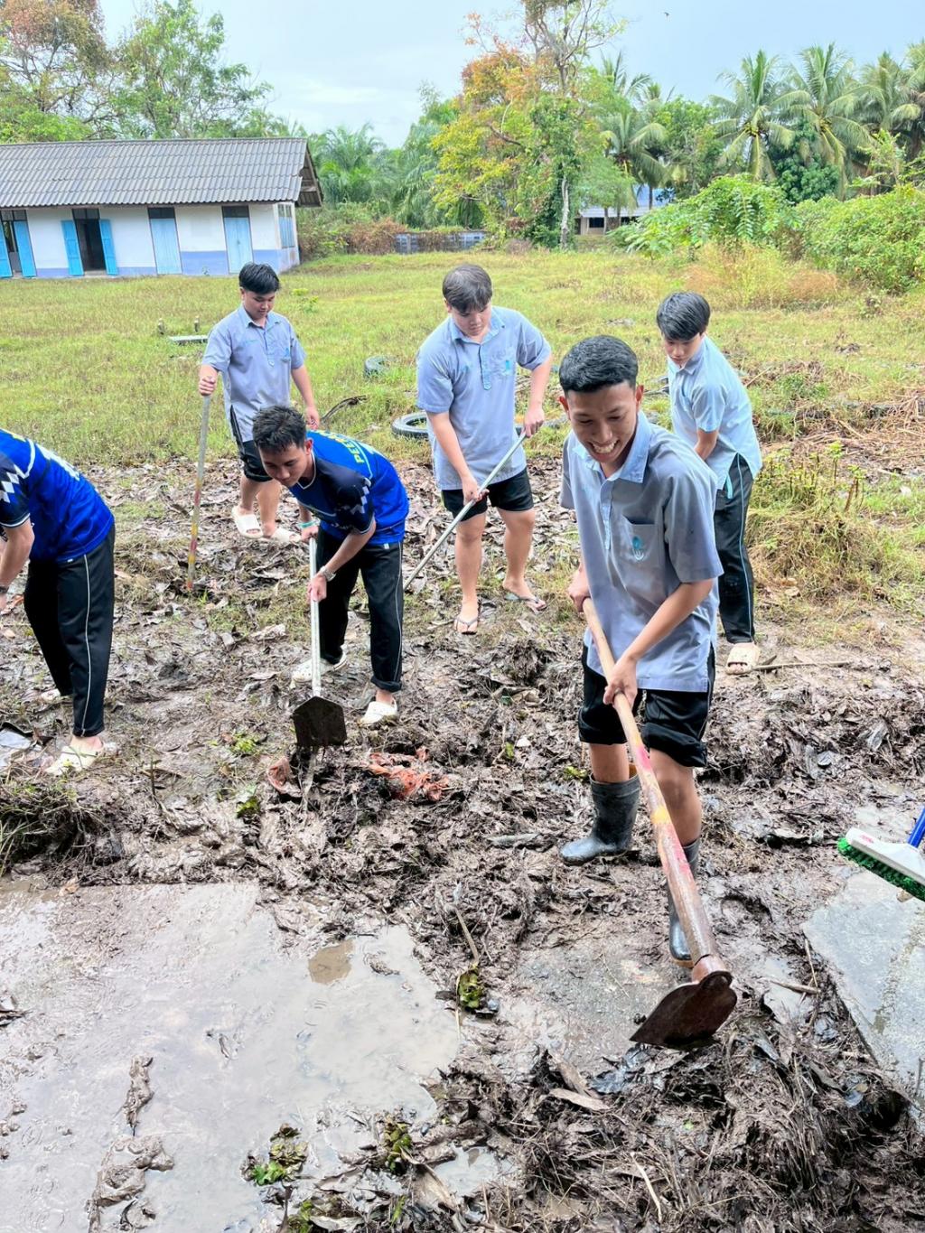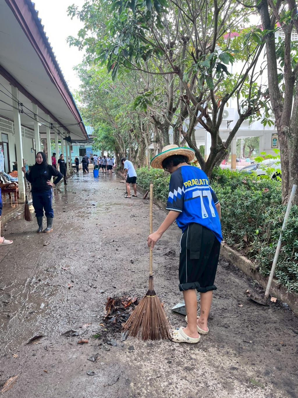 และนักเรียนจิตอาสา ได้ลงพื้นที่ช่วยเหลือผู้ประสบอุทกภัย ณ โรงเรียนวัดปากประ ตำบลลำปำ อำเภอเมืองพัทลุง จังหวัดพัทลุง